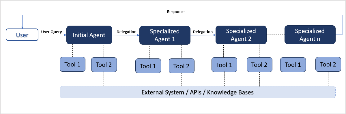 - Task Evaluation: This request is sent to a designated initial agent. The agent evaluates the intent and context of the query to determine if it can handle it or if it should be forwarded to a specialized agent.
