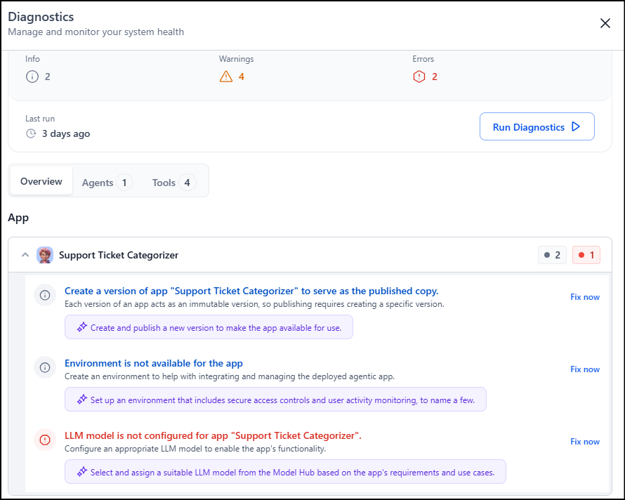 After the scan completes, the platform generates a structured report that categorizes findings as informational messages, warnings, or errors. Users can review issues at the app, agent, or tool level, and use the Fix now option to resolve problems directly from the Diagnostics panel, ensuring faster remediation and improved readiness before deployment.