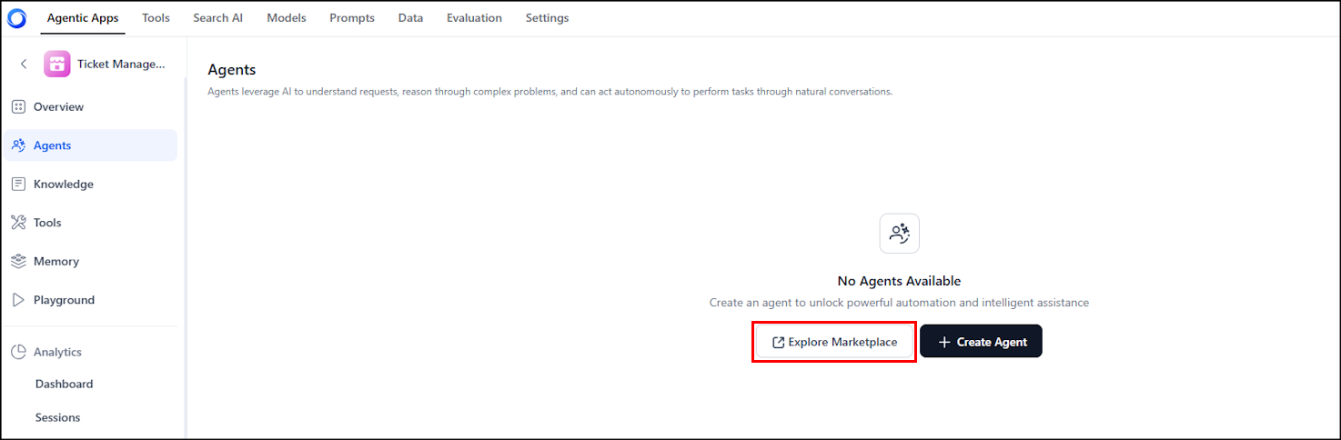 Go to Agentic Apps, select an existing app, and choose Explore Marketplace.