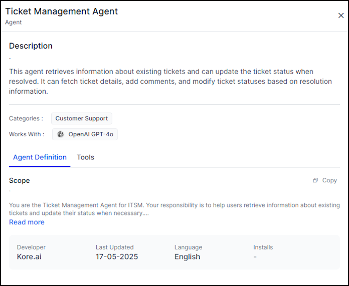 - (Optional) Connect to Search AI for knowledge base integration. Learn more about Knowledge Tool Integration.