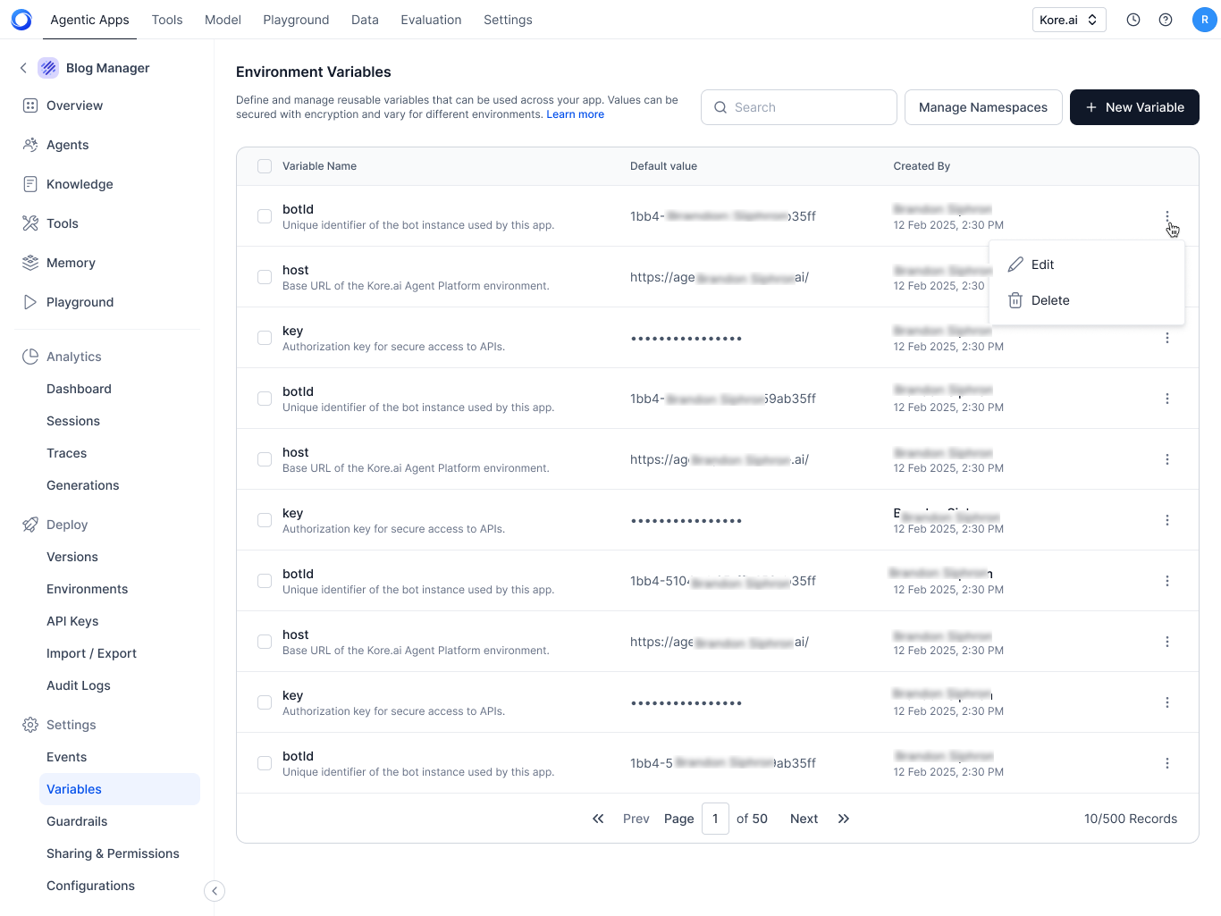 Use the Manage Namespaces option on the Variables page or when creating/editing a variable to view, create, or update namespaces.