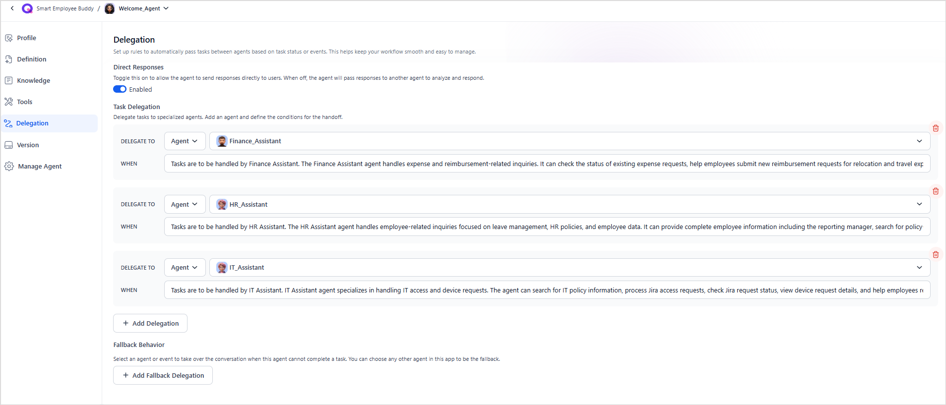 2. Configuring Delegation and Fallback Rules for the Agents¶