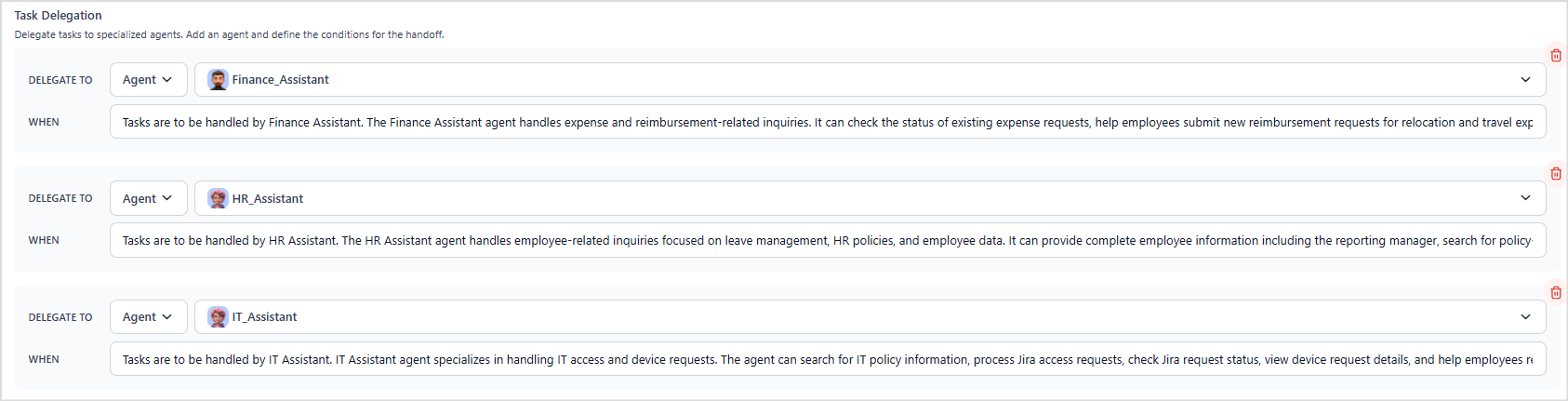 For example, the following agent can delegate tasks to three specialized agents—Finance Assistant, HR Assistant, and IT Assistant, depending on the nature of the task.