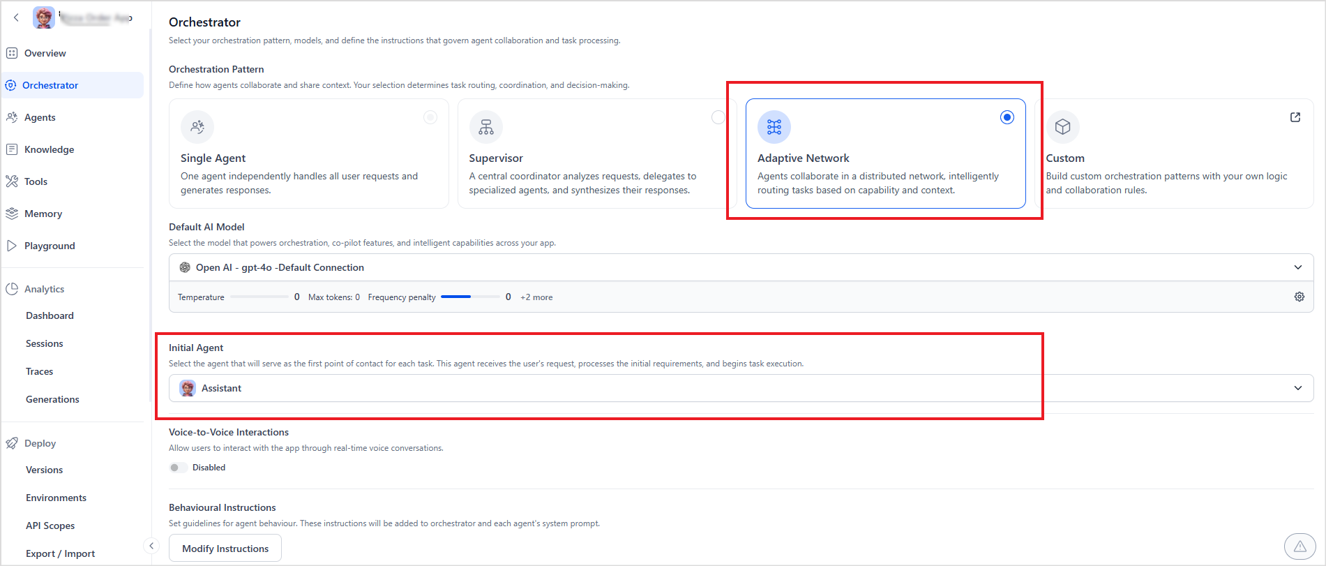 - Then, select an Initial Agent. The Initial Agent is the entry point for all queries and tasks. Every request is first routed to this agent, which evaluates the input before handing it off to the appropriate specialized agent.