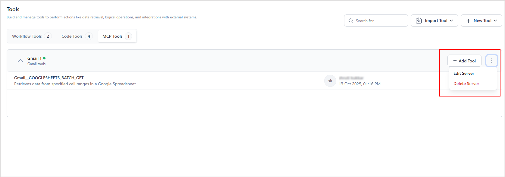 For instance, if the tool name is GMAIL_DELETE_DRAFT and the MCP server name is “GoogleMCP”, the tool name will be listed as GoogleMCP__GMAIL_DELETE_DRAFT.