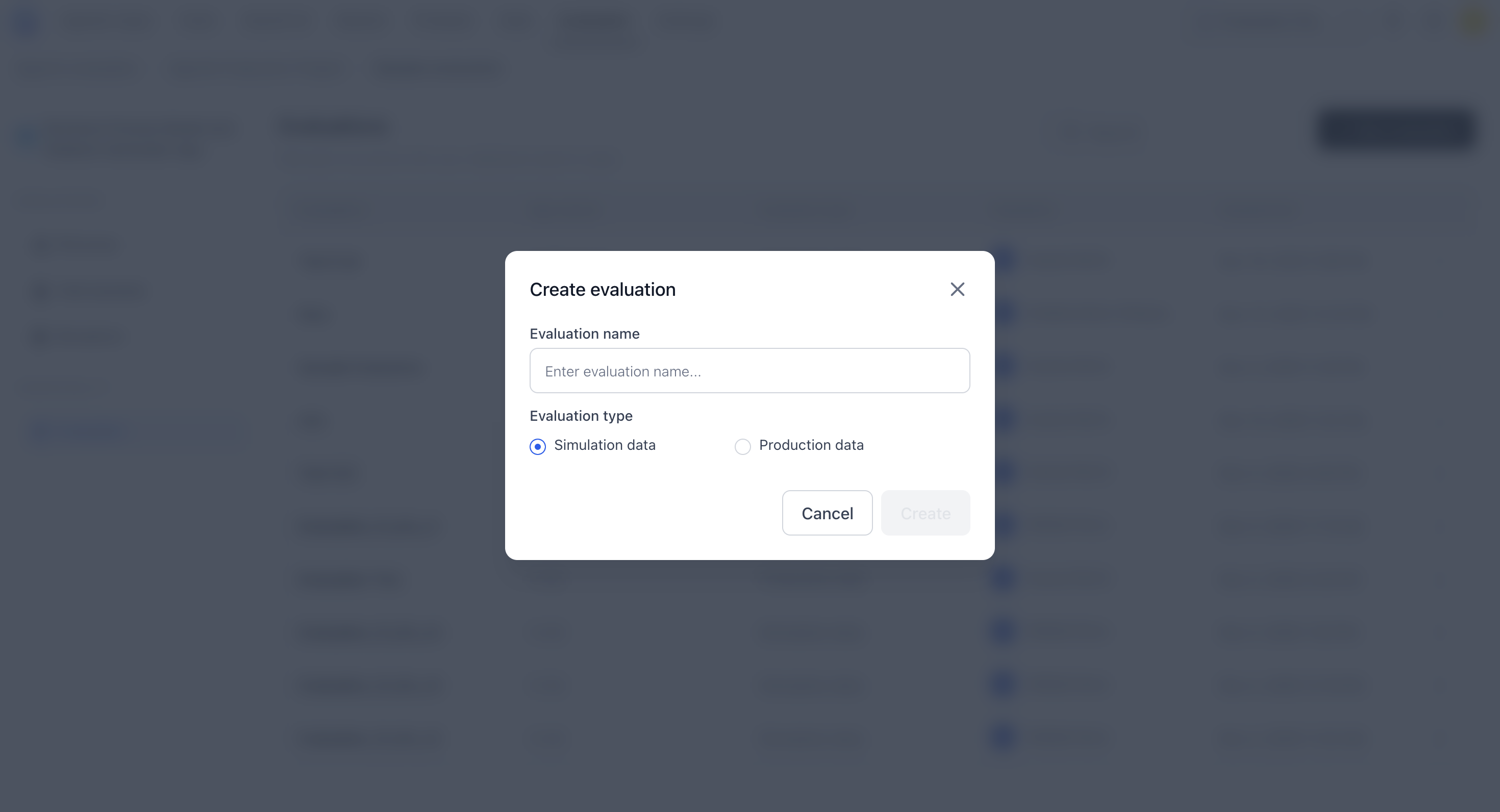 Once your project is set up, the next step is to create an evaluation where session data can be analyzed. Evaluations act as containers for imported sessions and are the starting point for applying evaluators.