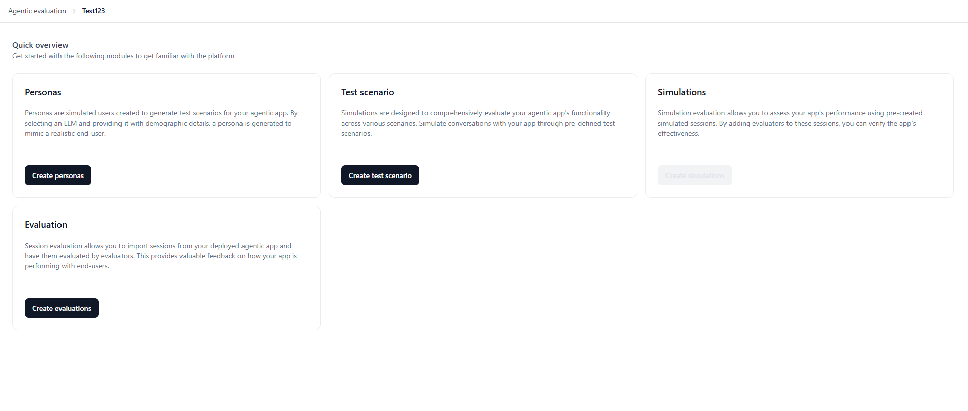- Simulated data: Create Personas → Define Test Scenarios → Run Simulations to import simulated sessions into an evaluation.