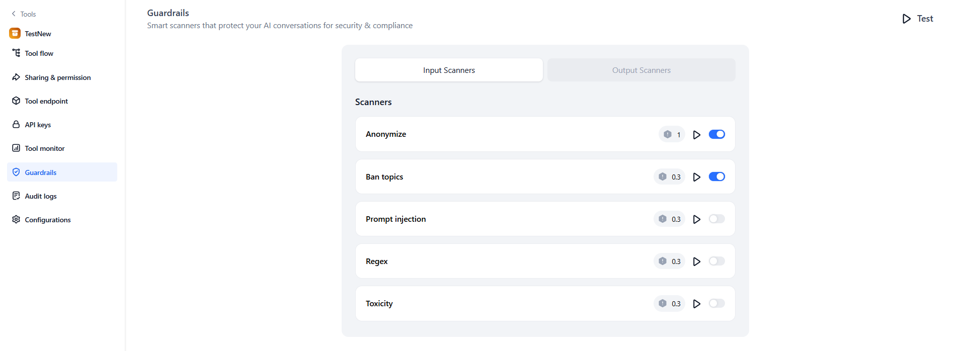 - Input scanners assess user inputs or prompts sent to an AI node.