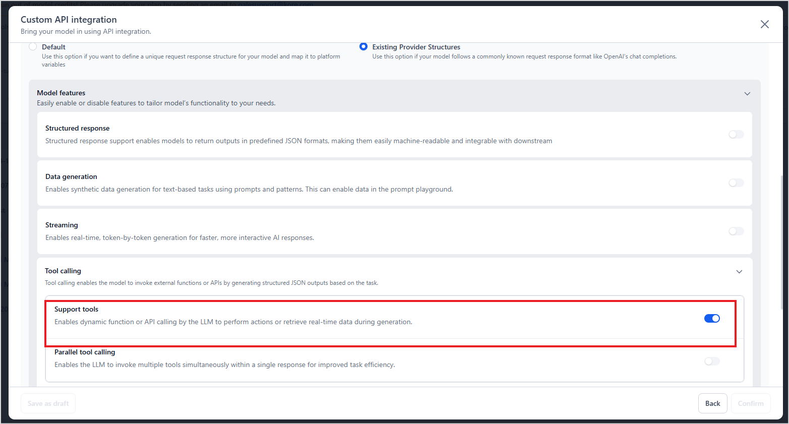 - Tool Calling Support: The model must inherently support Tool Calling functionality. For models that support Tool Calling, the feature must be explicitly enabled during model configuration.