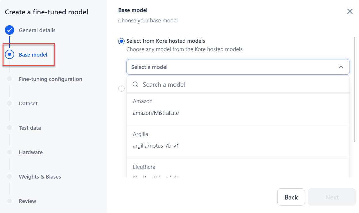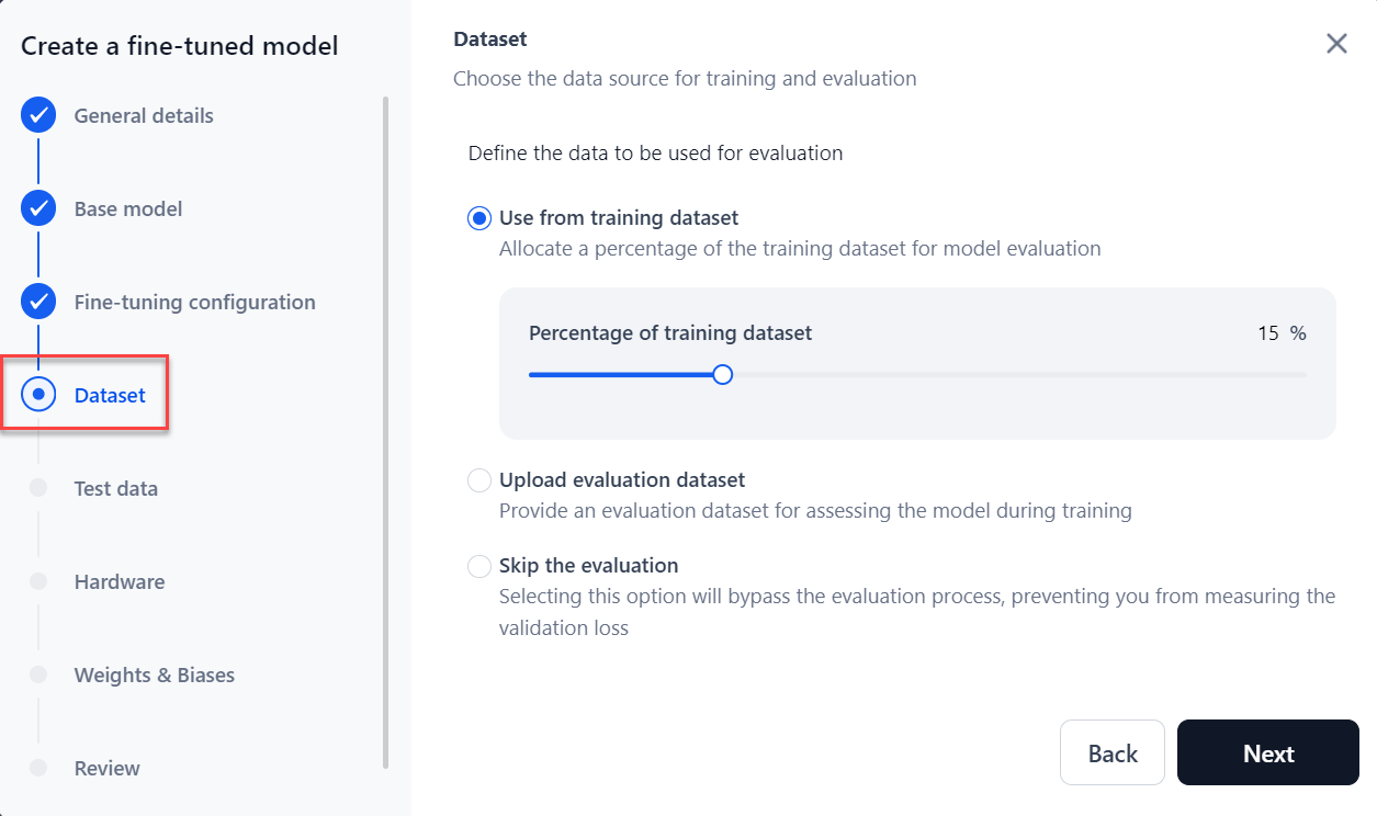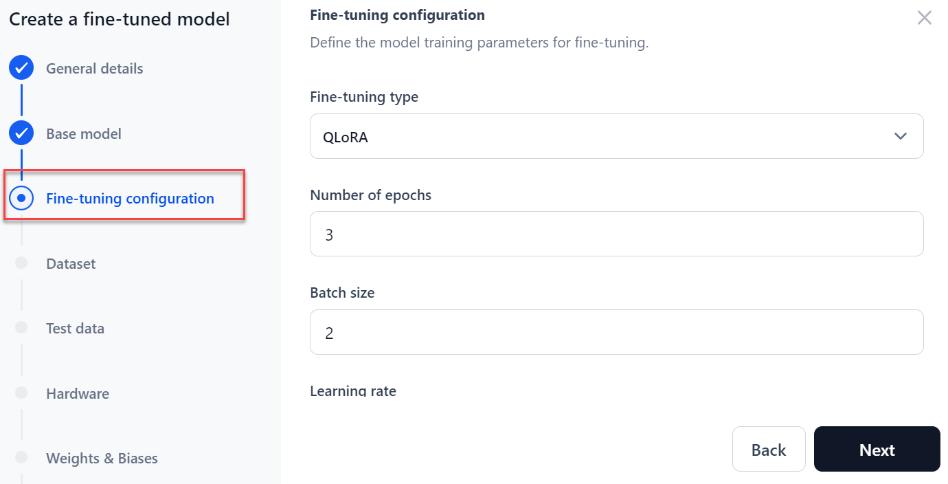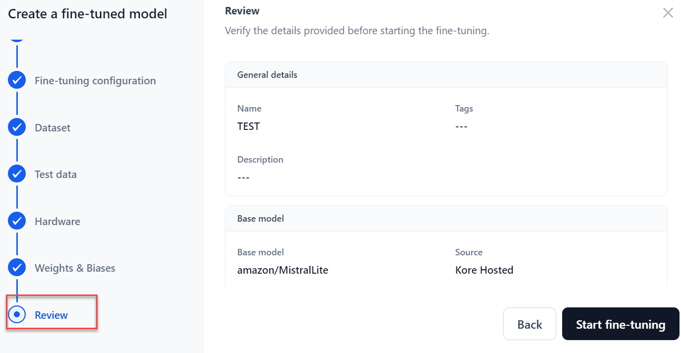 In the Review step, verify all the details before starting the fine-tuning. To modify previous steps, click Back.