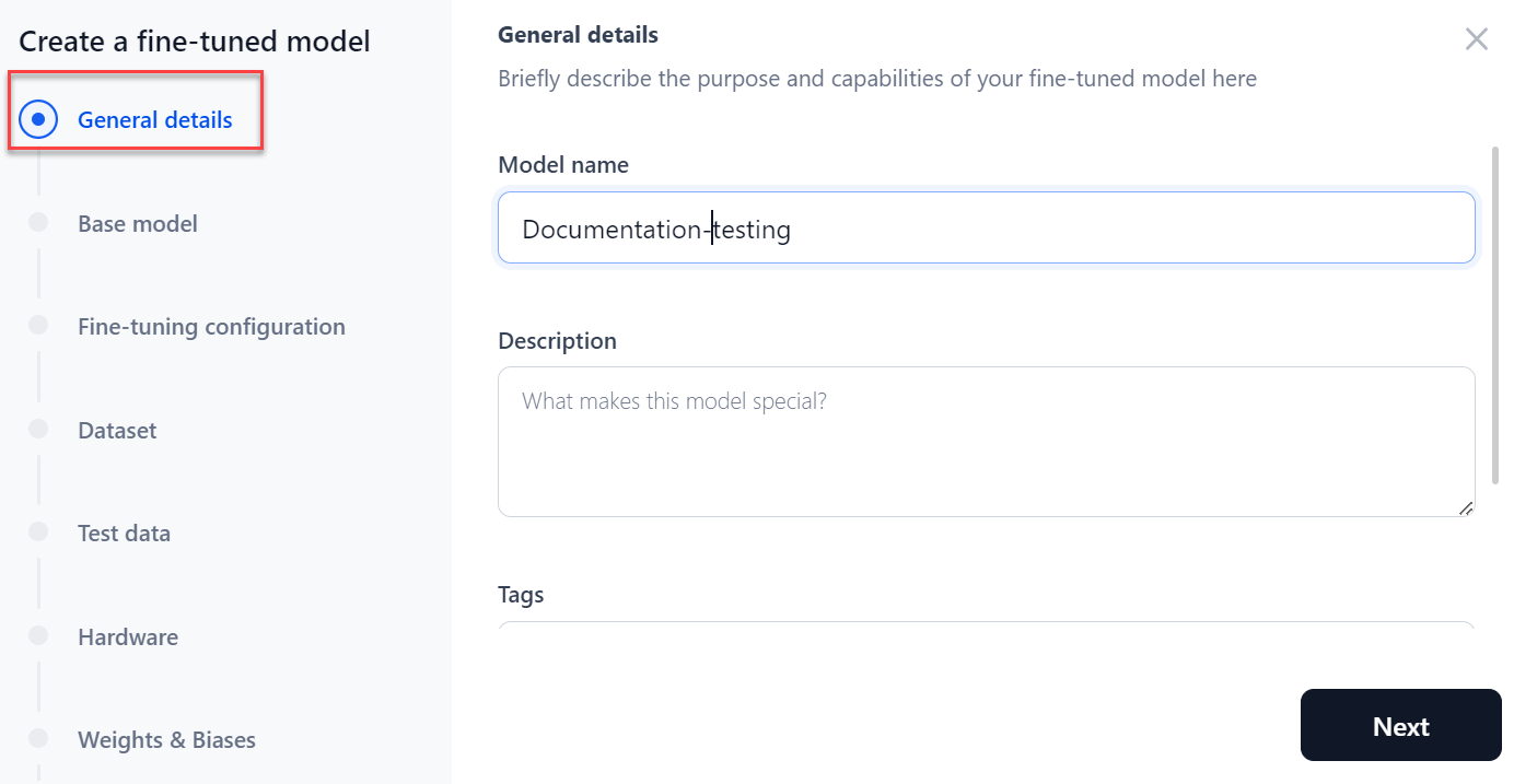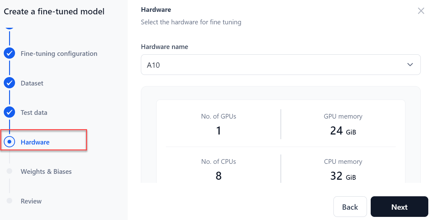 Select the required hardware for fine-tuning from the dropdown menu and click Next.