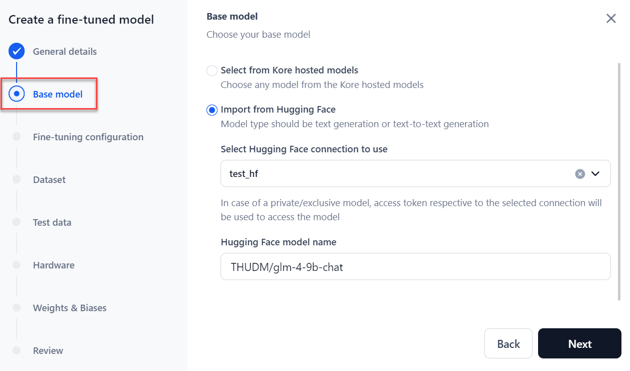 You can fine-tune a Platform-hosted model or import one from Hugging Face. The fine-tuning process involves the following steps: