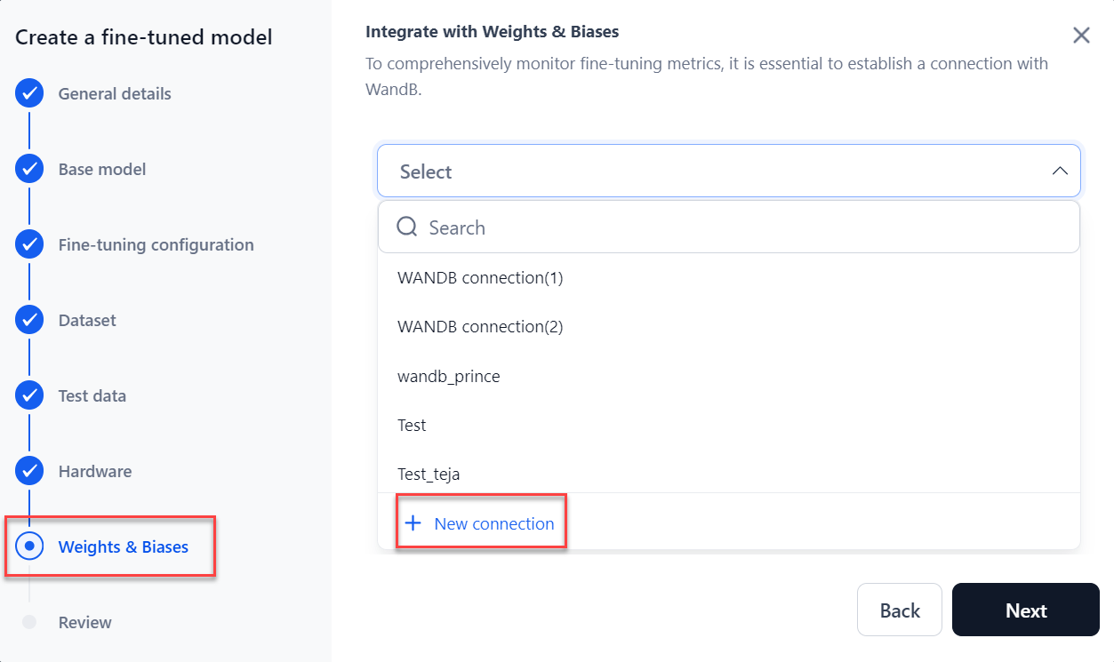 In the Weights & Biases section, select your WandB connection from the drop-down list and click Next. To create a Weight & Biases connection, click + New connection. For more information about how to create the WandB account, see How to Integrate with WandB.