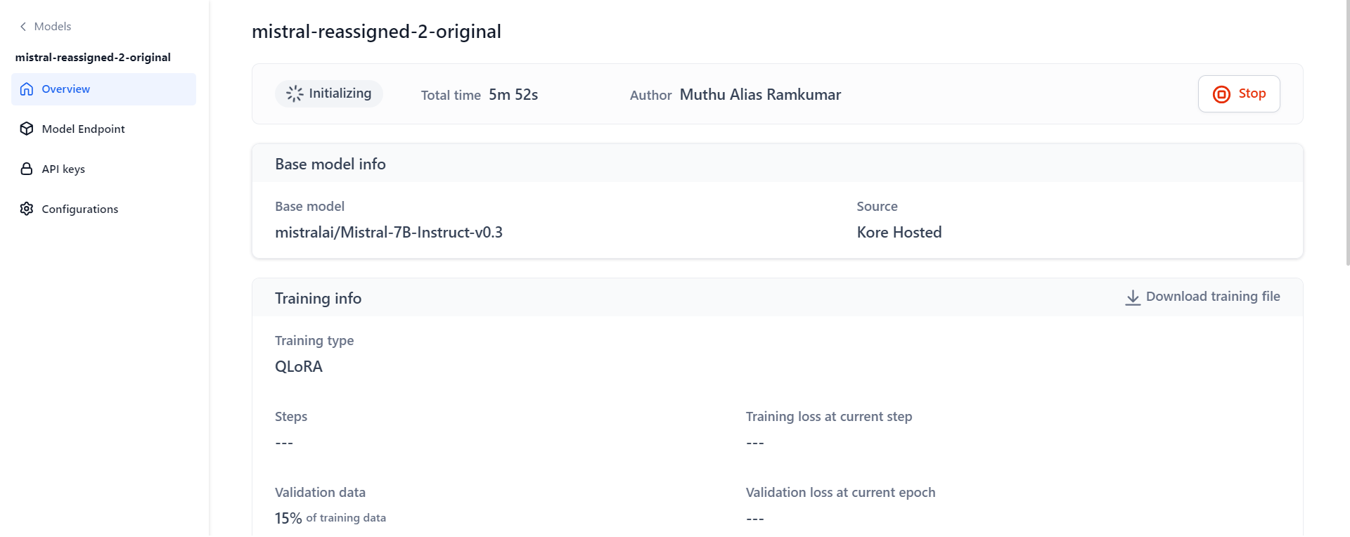The model Overview page displays real-time progress. You can also view the model’s overview page by clicking the model on the Fine-tuned models page. Learn more.