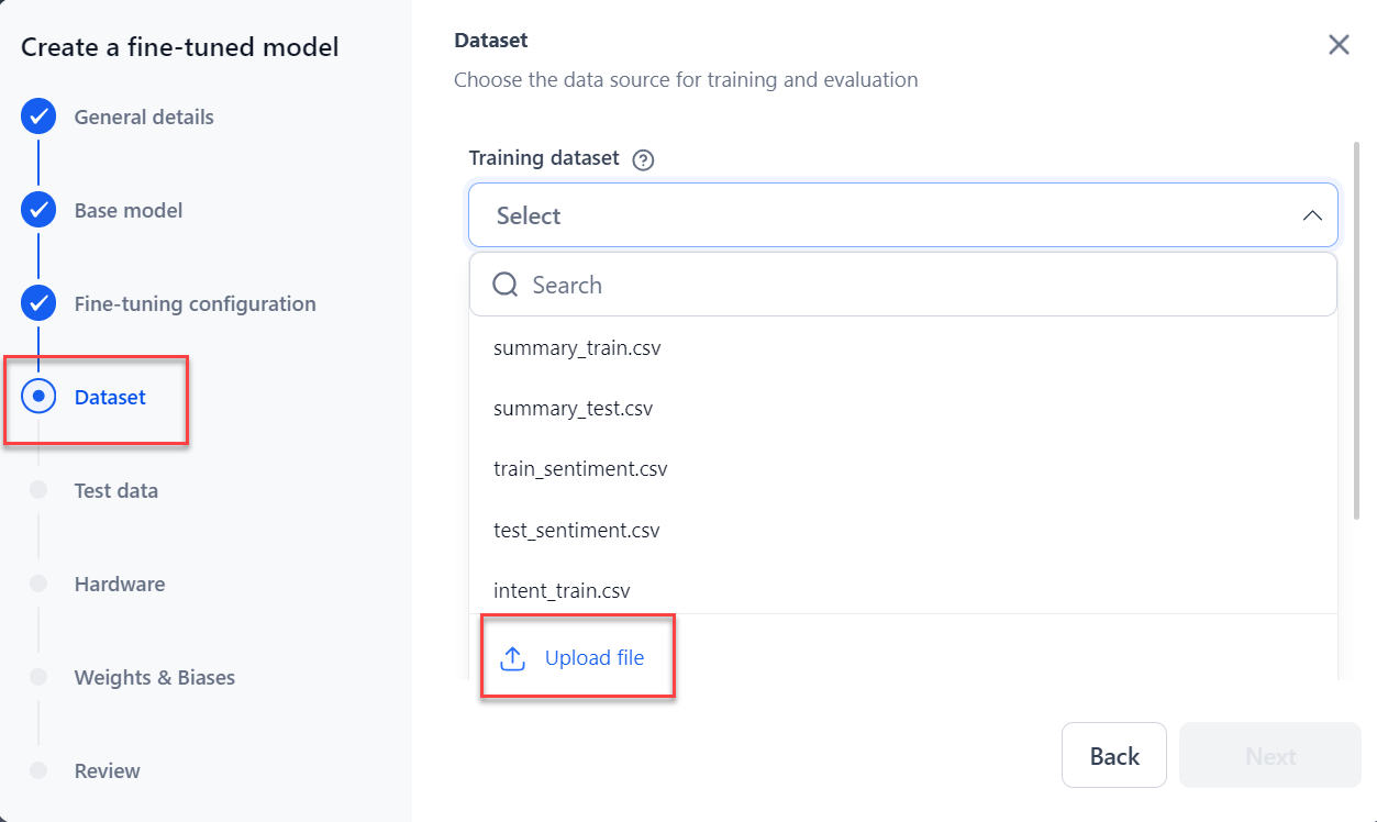Select or upload the test dataset to test the fine-tuned model. Click Next.