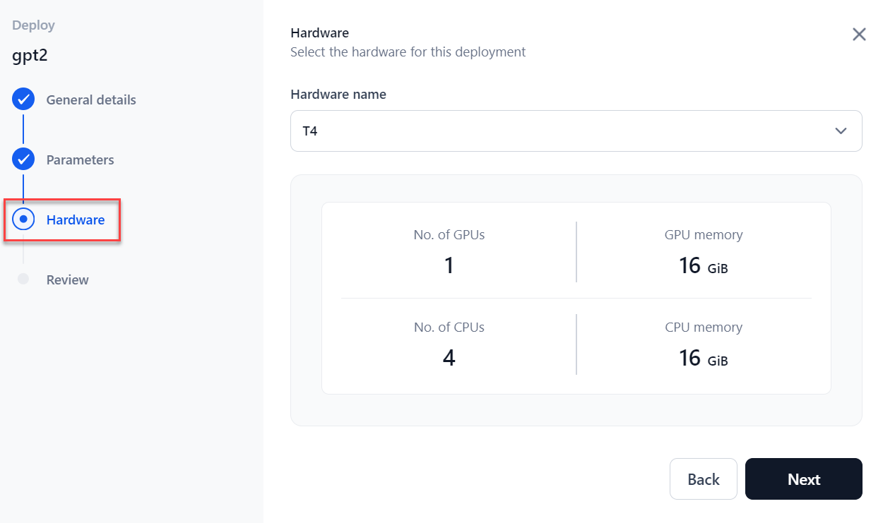 Select the required Hardware for deployment from the dropdown menu and click Next.
