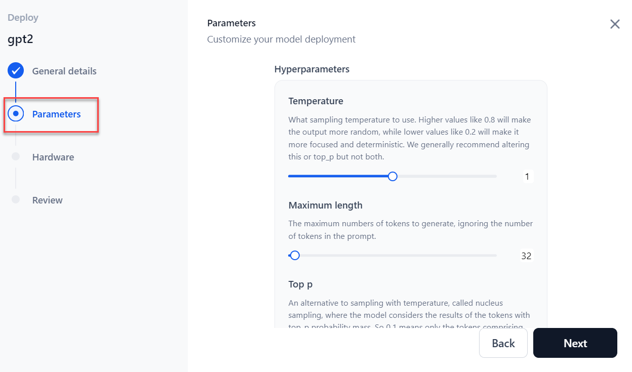 Select the Top p which is an alternative to sampling with temperature where the model considers the results of the tokens with top_p probability mass.