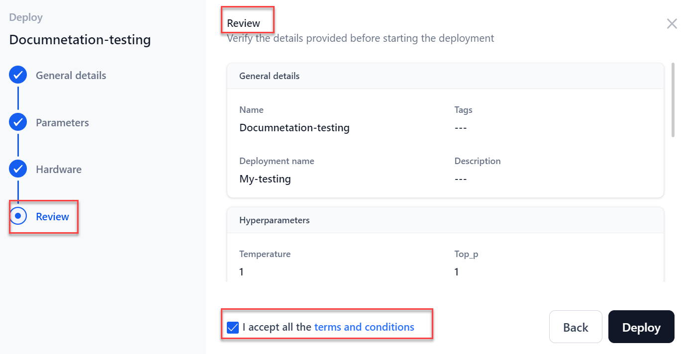 In the Review step, verify all the details that you provided earlier. Select the I accept all the terms and conditions check box.