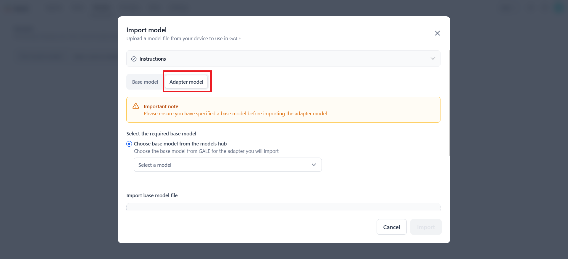 - Ensure model compatibility: When importing an adapter model, always verify that it is compatible with a supported base model. The system informs you that a base model is required, so ensure that you select a base model from the Platform-hosted list before proceeding with the adapter model upload.