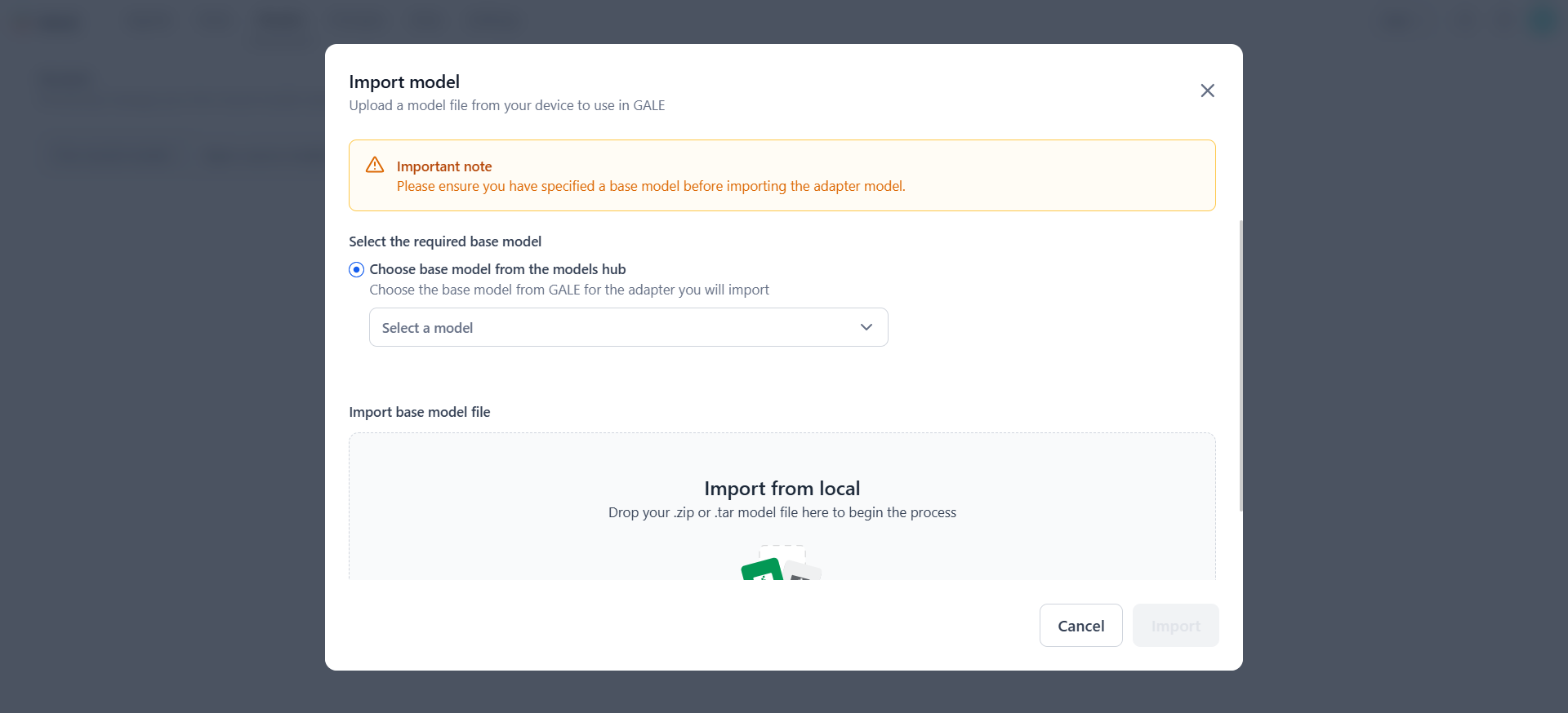 - One model at a time: To avoid conflicts or issues with multiple simultaneous imports, import one model file at a time. Ensure that each model (whether base or adapter) is fully imported and validated before proceeding to the next.