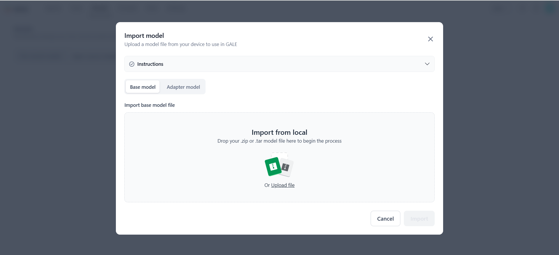 Click ‘Instructions’ to view the detailed guidelines for the supported format and the necessary files to include in the zip folder for both base and adapter models. -