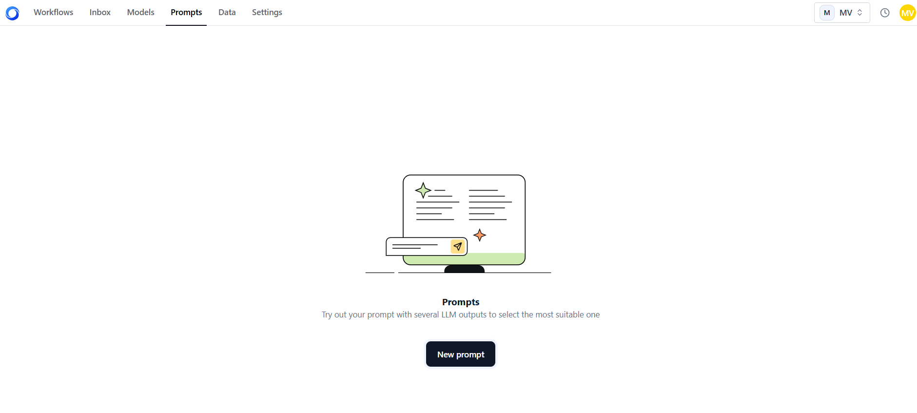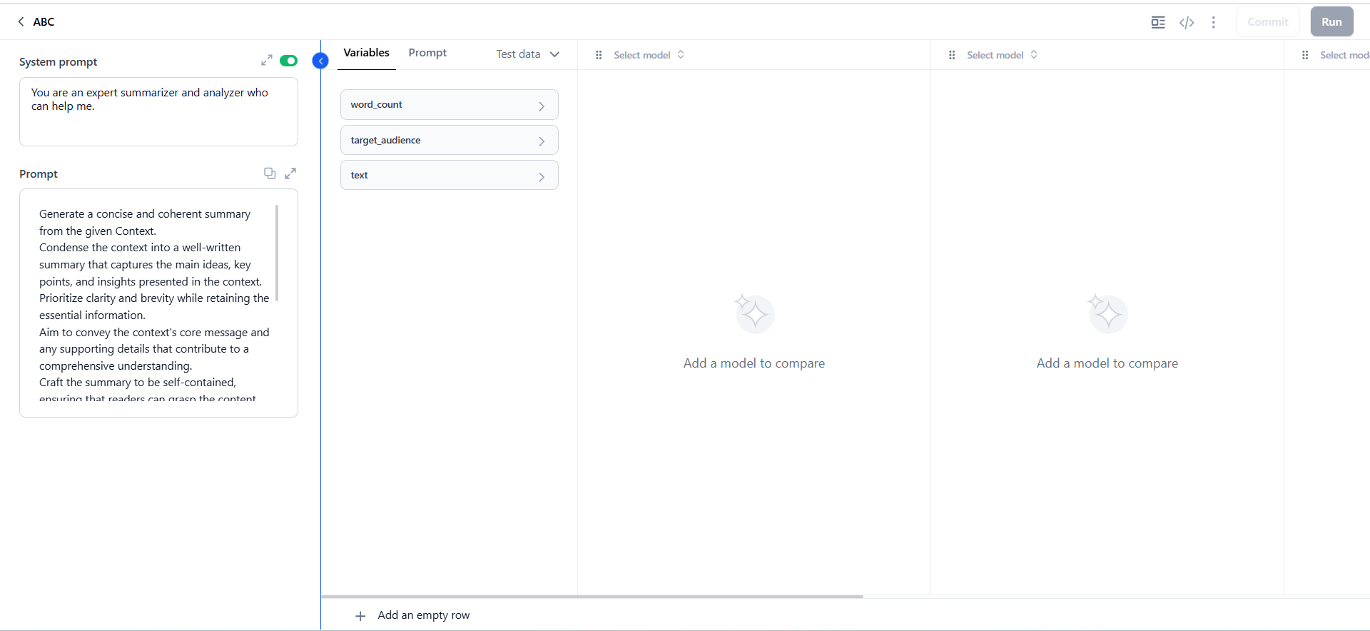 The Start from Scratch option gives you complete flexibility to create custom prompts. When you select this option, you will be directed to a blank prompt canvas, where you can add your prompts, add variables manually or by importing data, add models, and generate your output.