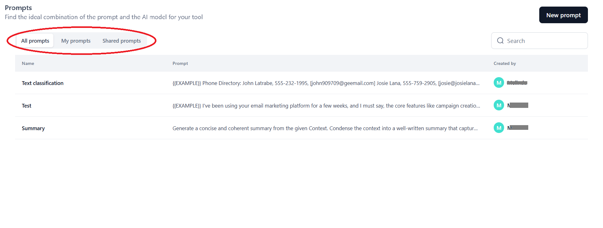 - Shared prompts: Displays prompts that others have shared with you for use or collaboration.