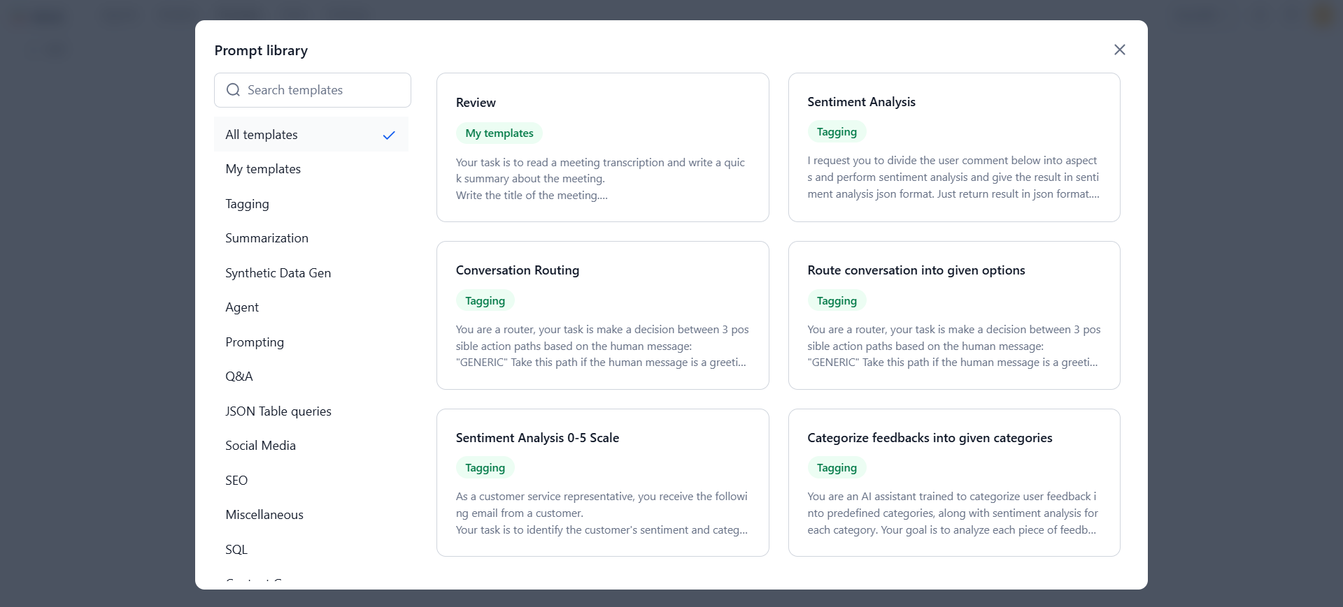 The Prompt library includes a collection of 65+ built-in templates, each featuring pre-designed prompts ready for use. You can easily import these templates and start crafting your own prompts by choosing from a variety of carefully designed templates tailored for various use cases. The prompt library simplifies the prompt creation process and enhances your productivity by enabling you to access high-quality prompts.