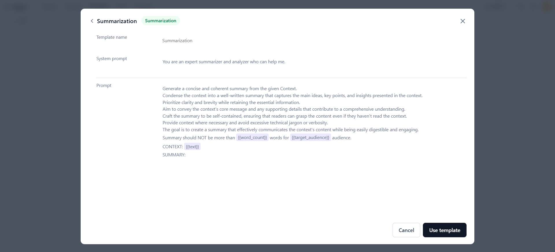Click your desired template. A dialog box with the system prompt and prompt is displayed. To use the template, click Use template.