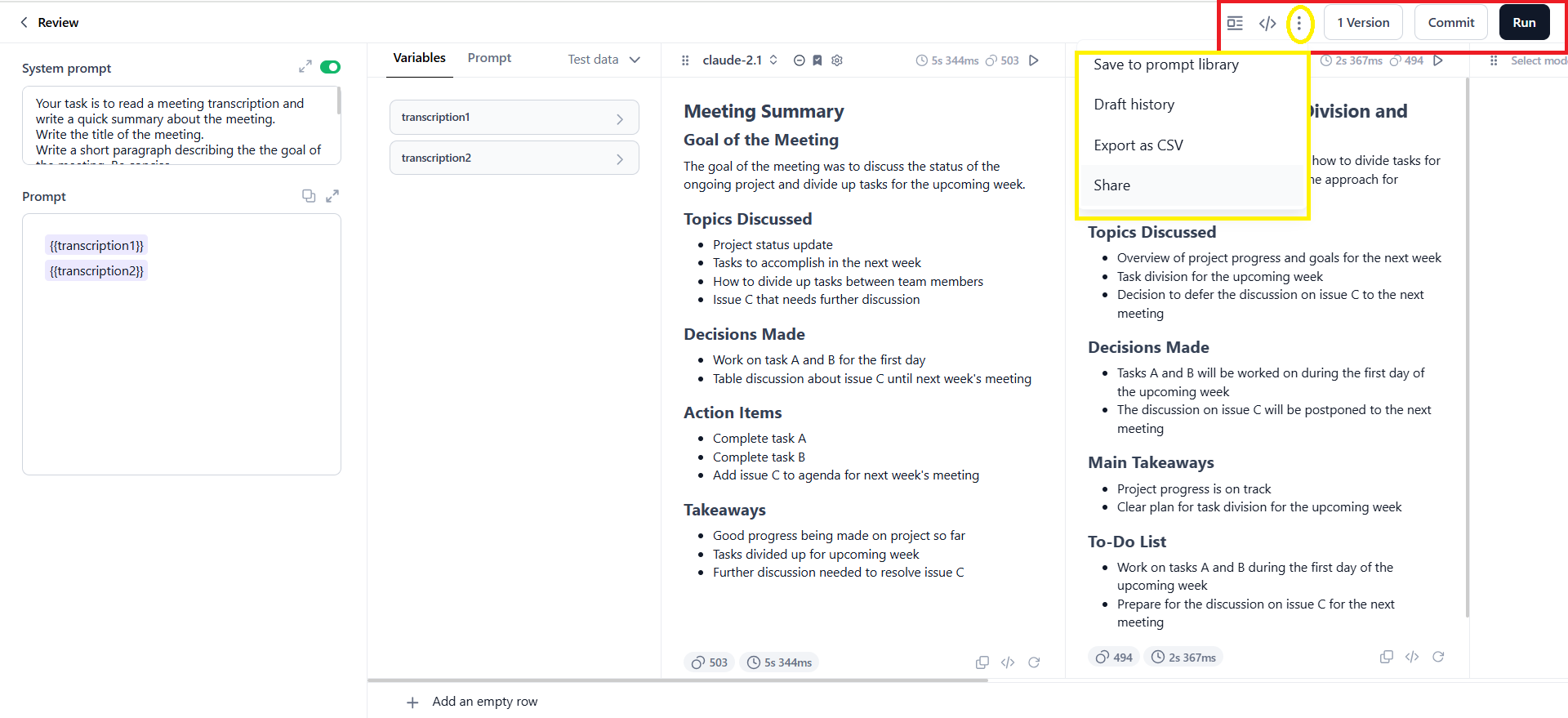 Exports the entire prompt canvas (including inputs, outputs, and metadata) into a CSV file for offline analysis or sharing. Click the three dots icon and export the prompt canvas as a CSV file.