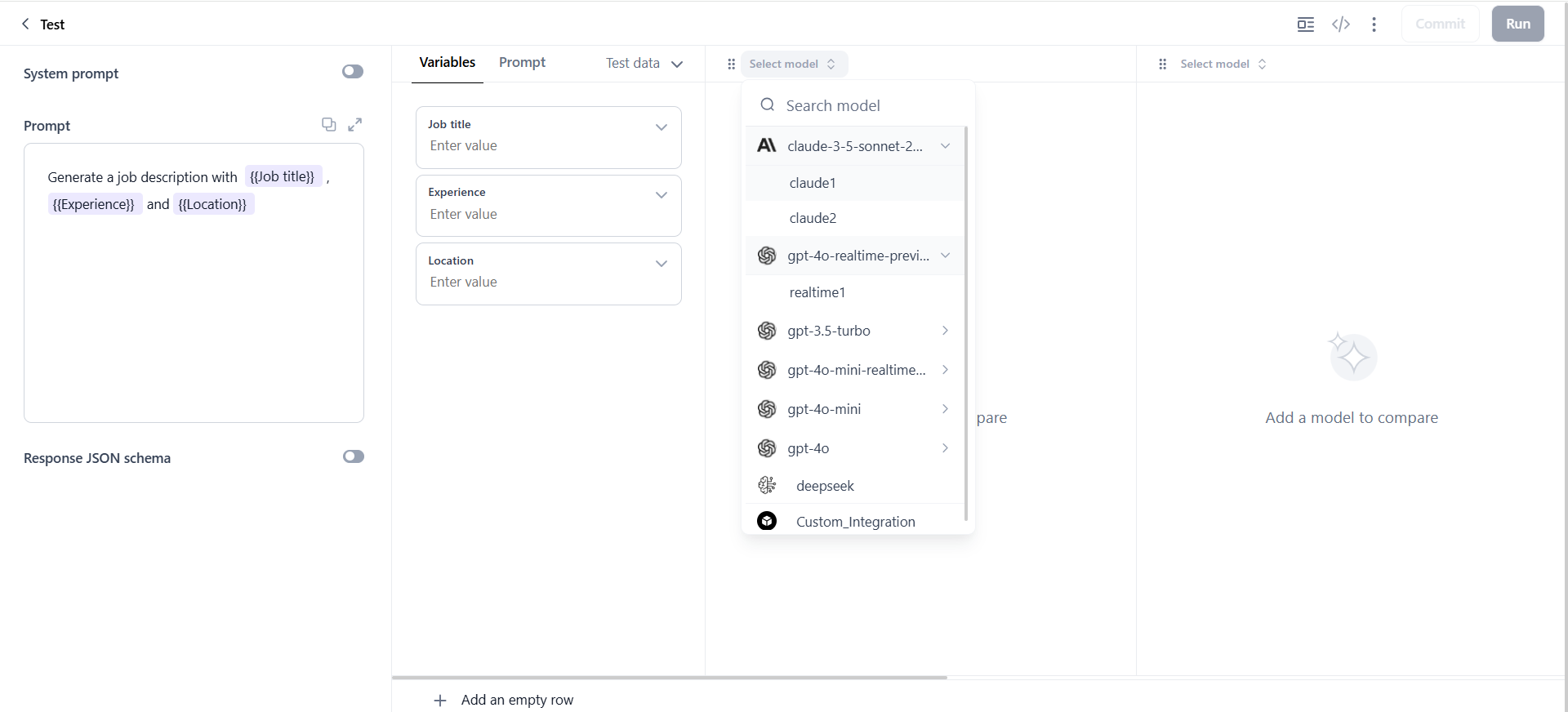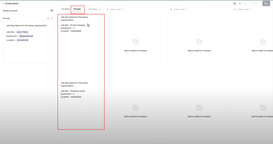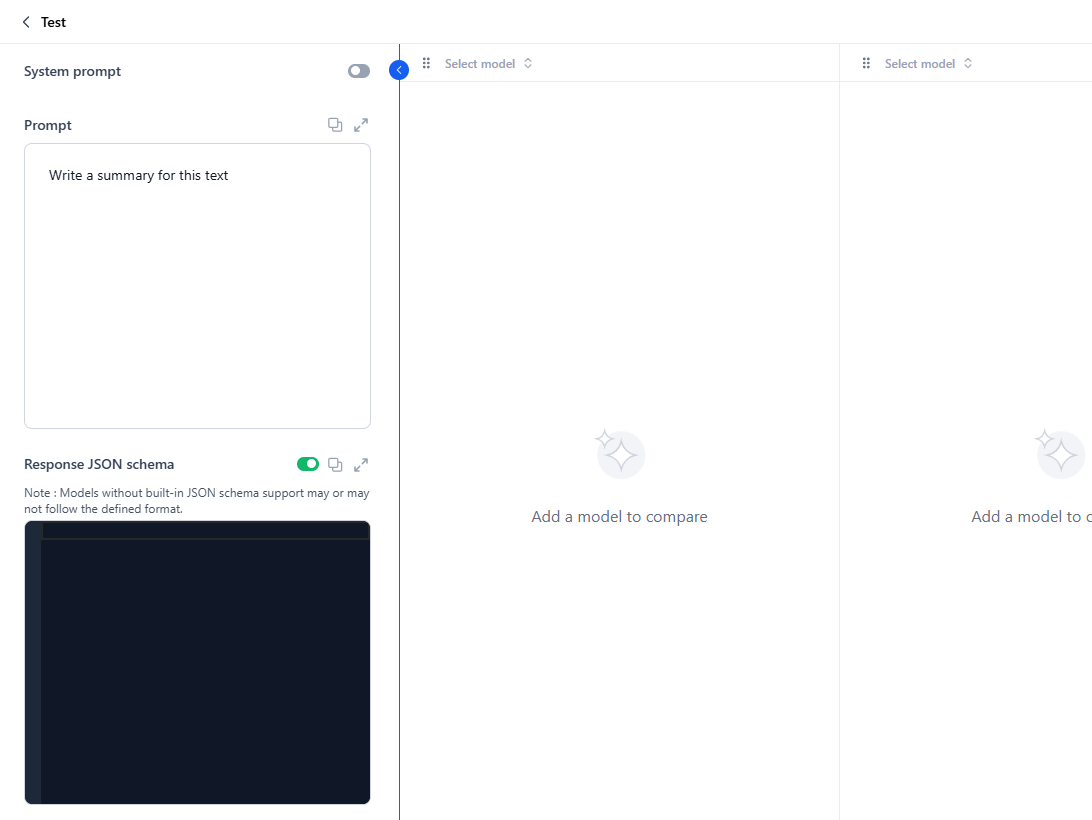 Test your prompts with different AI models to identify which one best aligns with your needs. You can add and compare multiple models to determine which model provides the most suitable output. You can evaluate factors like accuracy, tone, and relevance to identify the model that provides the most suitable and effective output for your specific use case.