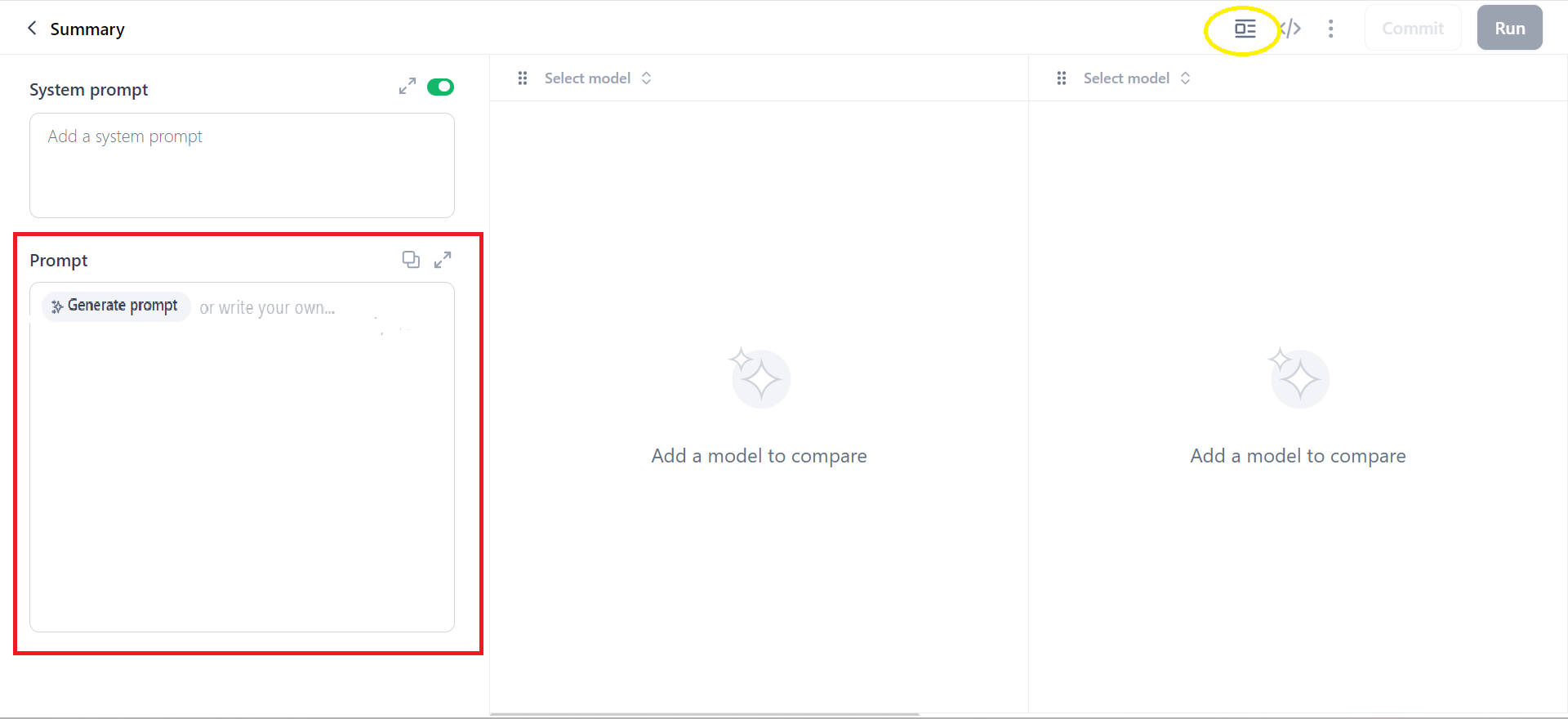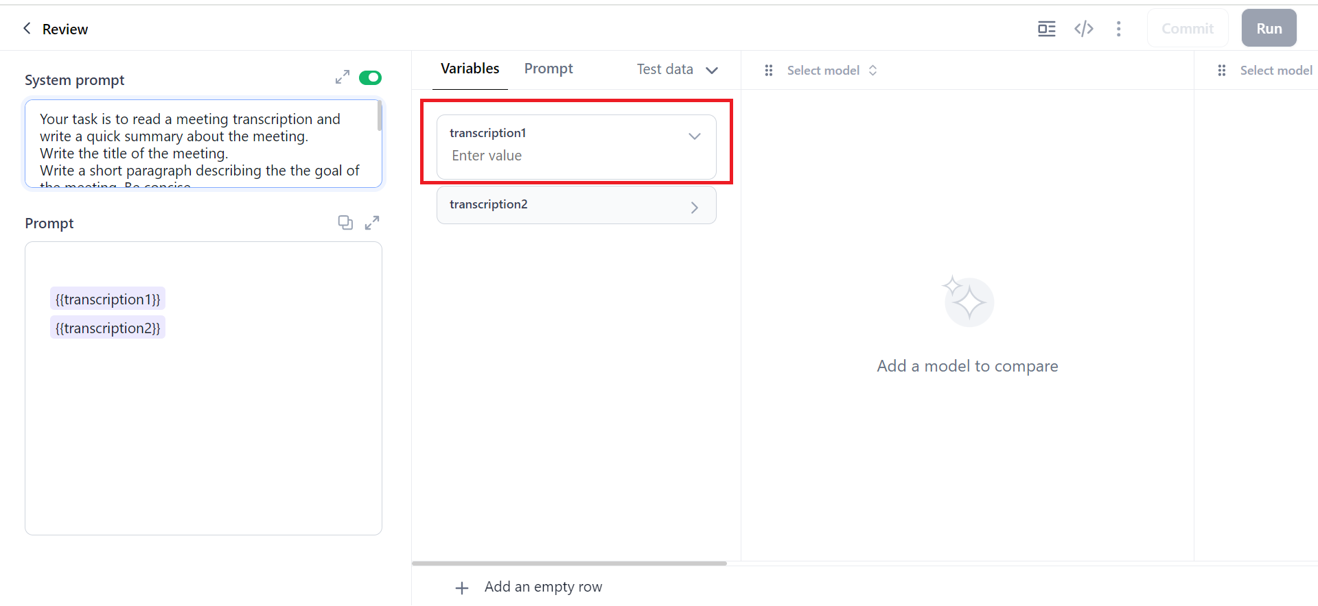 - Apply variables - Introduce any necessary variables to customize your prompts. You can add variables manually or import variables from a dataset.