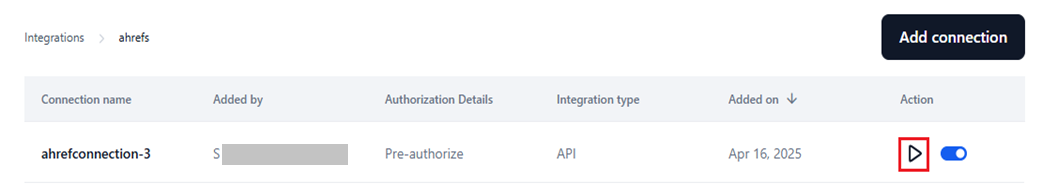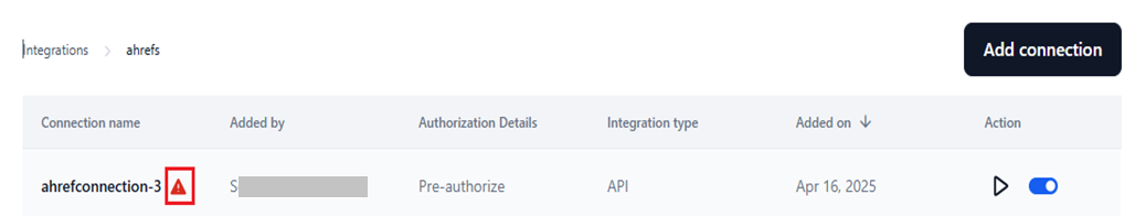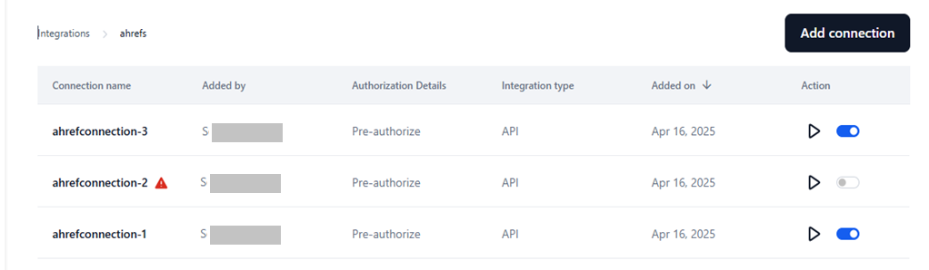 Once you click the integration in the Connected section, the list of configured connections is displayed with the following information: