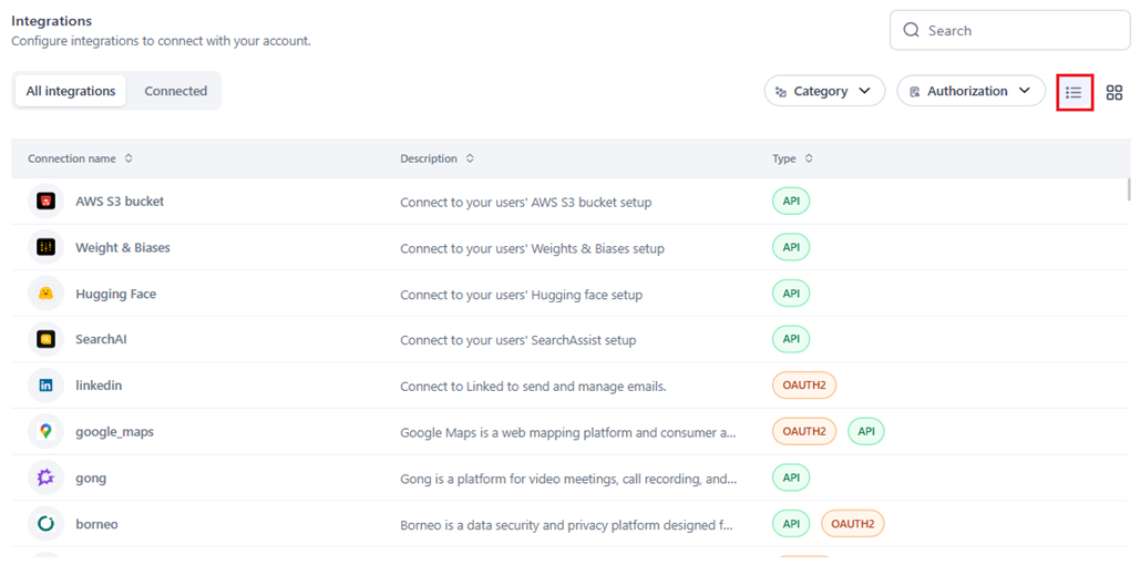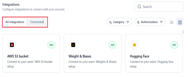 Click the All Integrations tab to see available integrations grouped by category. You can add a connection to these integrations using a supported authentication method, such as API, OAuth2, Bearer Token, or Basic Auth. AI-based integrations you can connect to include AWS S3 Bucket, Weight & Biases, and Hugging Face. The category you select filters which integrations are shown in this list.