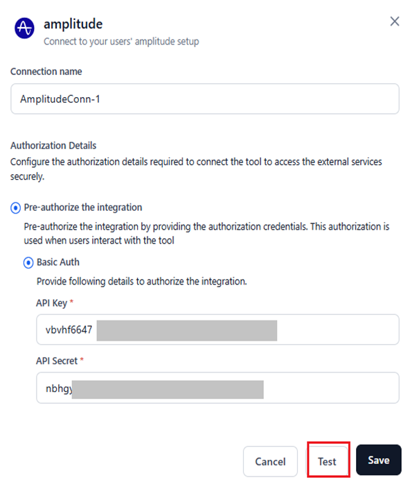 - When you select this auth type, you must provide the required configuration values. For example, an Amplitude project requires an API key and API secret.