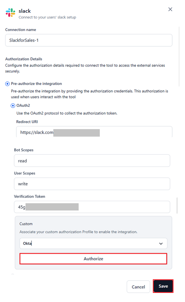 The Pre-authorize the integration option is auto-selected, indicating that you must provide authentication credentials to interact with the workflow or service. You can select the preferred authentication method, such as OAuth2, Bearer, or Basic Auth, from the available options to configure the credentials.