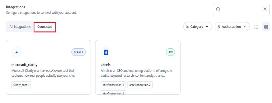 Once you configure and connect to a third-party service, that integration appears in the Connected section and is no longer visible in the All Integrations list. If you delete the connection, the integration will return to the All Integrations list, allowing you to reconnect in the future.