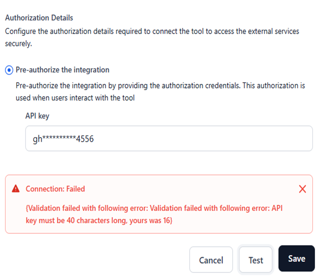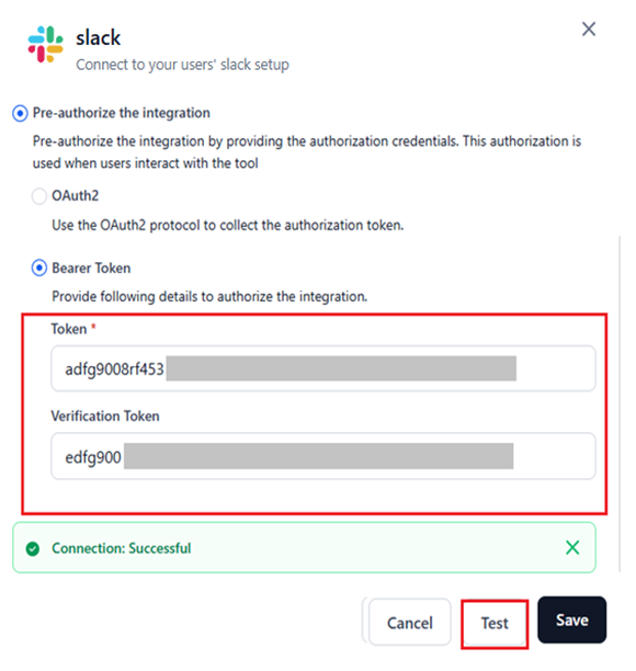 - When you select this auth type, you must enter the bearer token along with related information such as the Base URL, API Key, Bot Token, or other relevant credentials.