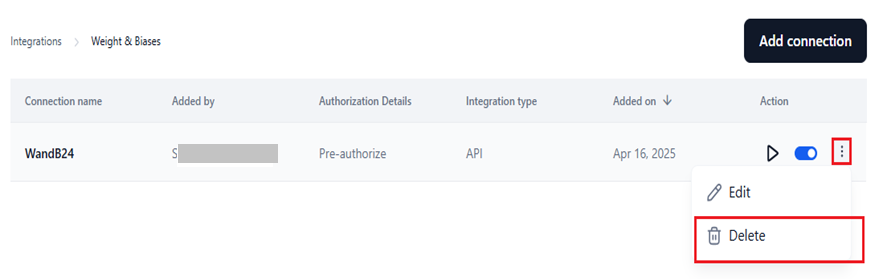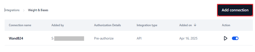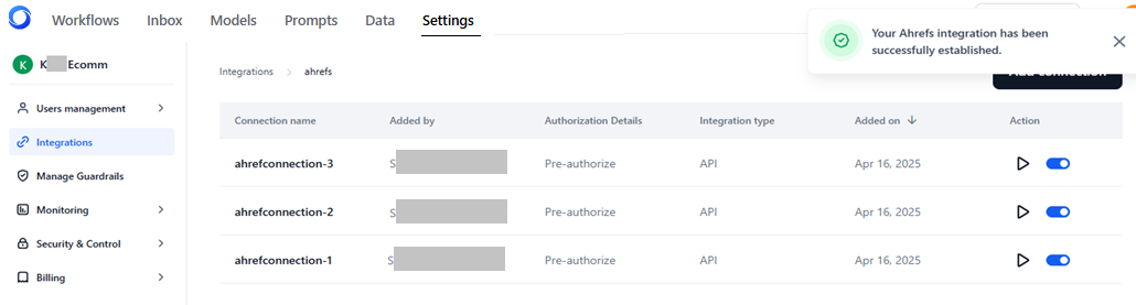 Enabling a connection makes it available for user authentication with the service provider. It also becomes accessible for use in the Integration node on the workflow canvas.