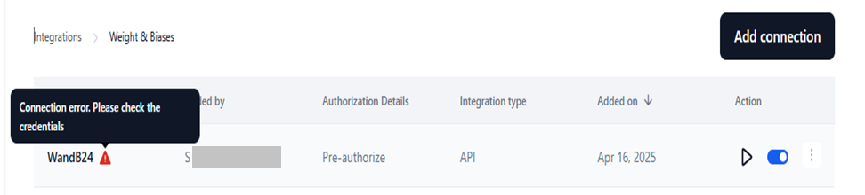 During or after setting up a connection, errors may occur due to invalid credentials when adding a connection.