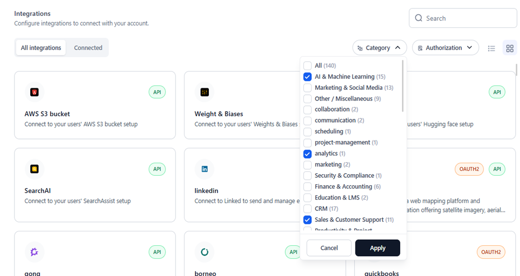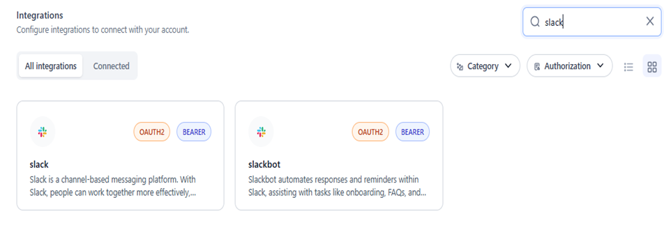 - (Optional) In the All Integrations tab, select the Category and Authorization from the respective lists to filter the integration options.
