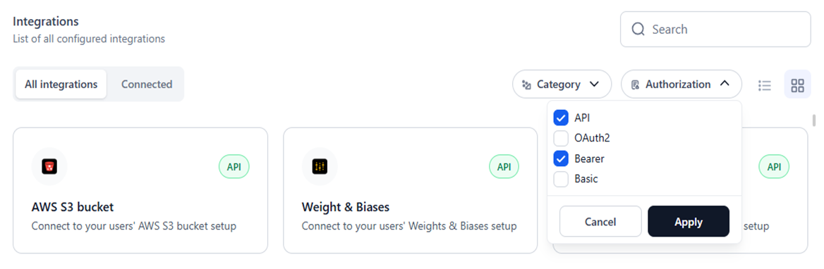Authorization Dropdown List: The available types for authentication methods are API, OAuth2, Bearer, and Basic Auth. Refer to the introduction of this article for more details. Select the required option(s) and click Apply to view the relevant integrations.