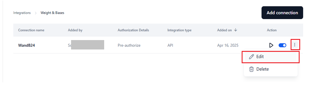 You can view, edit, delete, and perform additional actions with connected integrations to your account in the Connected section.