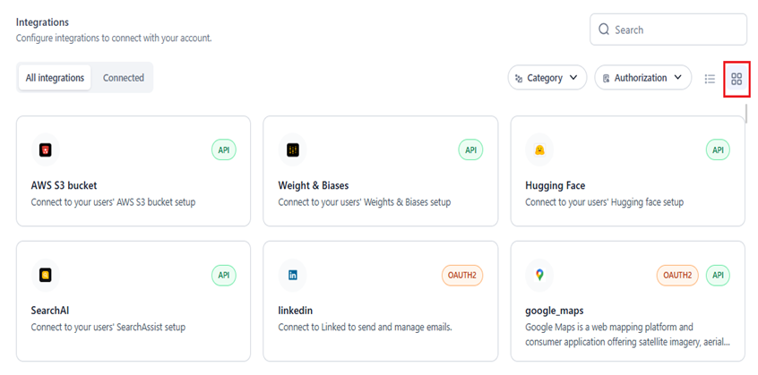 Tile View: This is the default view. Click this icon to view all the integrations as individual cards.