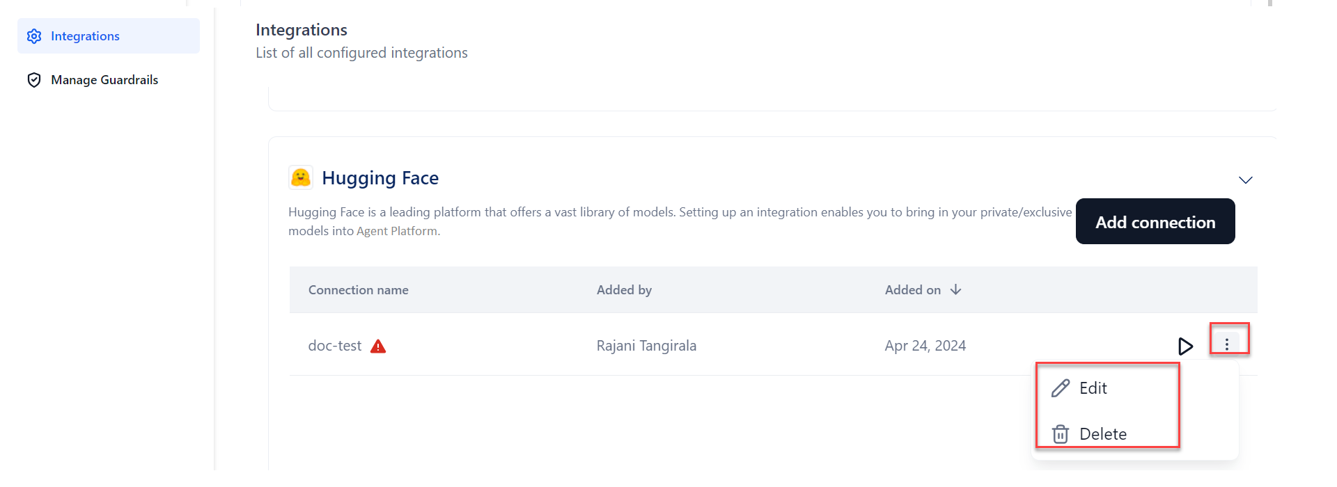 Hover over the connection name and click the three dots icon corresponding to the Connection name. The list of options is displayed. Click Edit to modify the connection details and Delete to delete the connection.