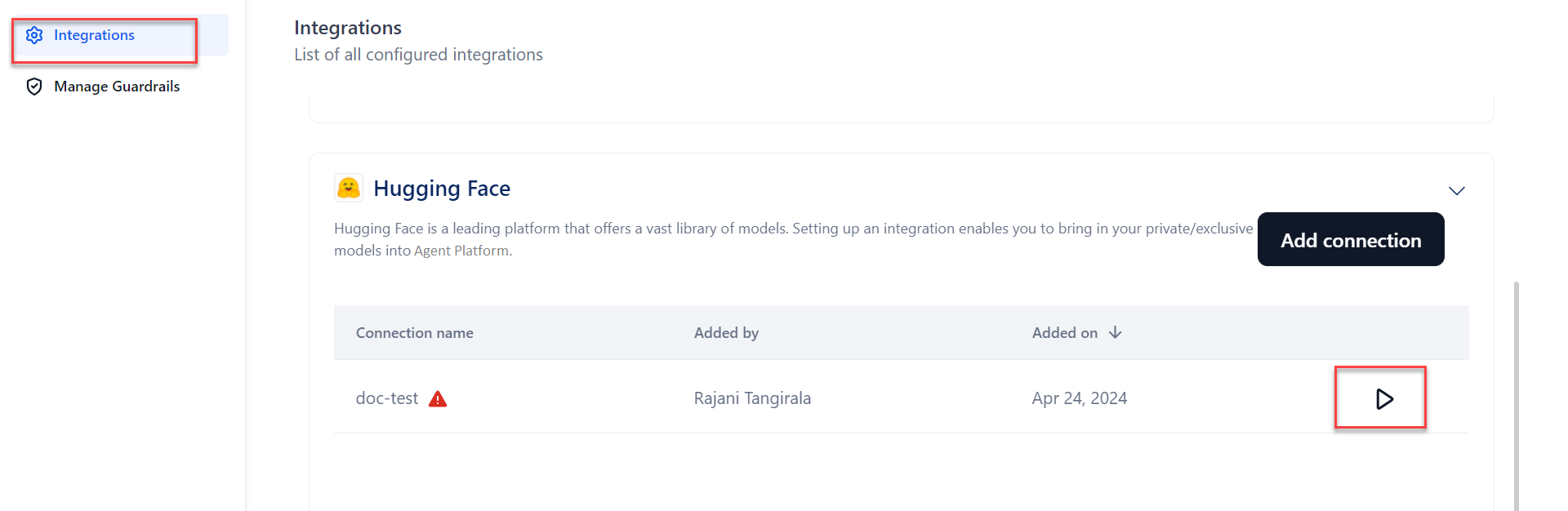 Once the Hugging Face connection is completed, you can see your connection name in the drop-down box while selecting and deploying an Open-source model. For more information about selecting and deploying, see Select and Deploy an Open-Source Model.