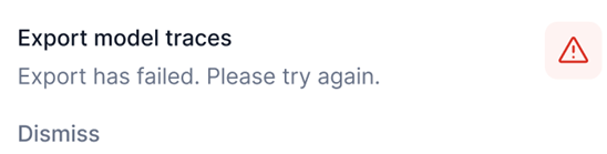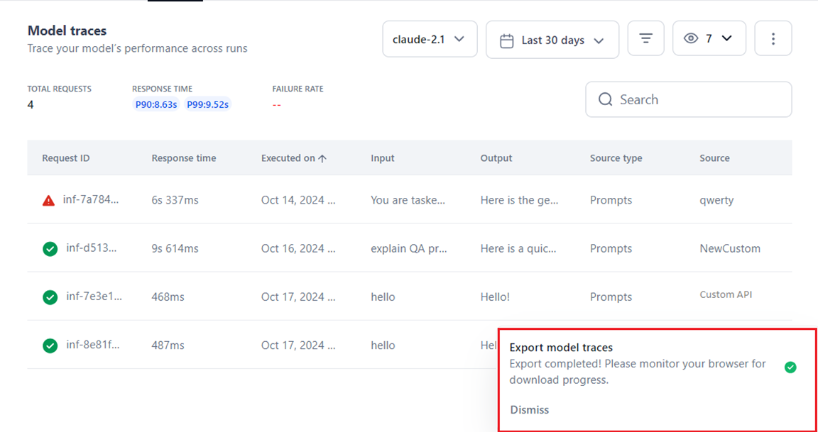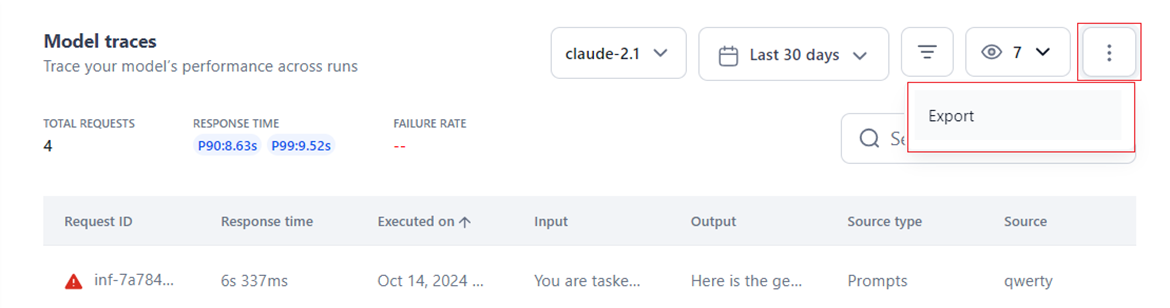 - Export Data: Click Export to generate a CSV file of your model traces records based on the selected date range and filters. Note that all eight columns in the table are prepared and exported, irrespective of the applied visibility filter.