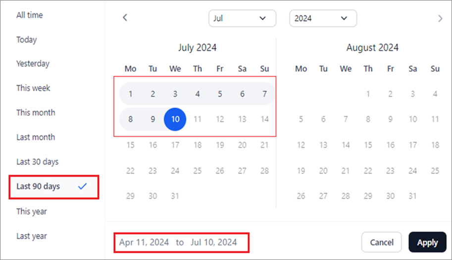 - Last 90 Days: Displays logs for the past 90 days from the current date.