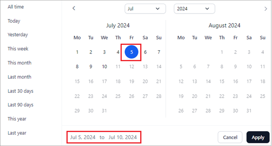 The date range is automatically selected on the calendar widget once you select the period and displayed at the bottom of the widget.