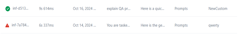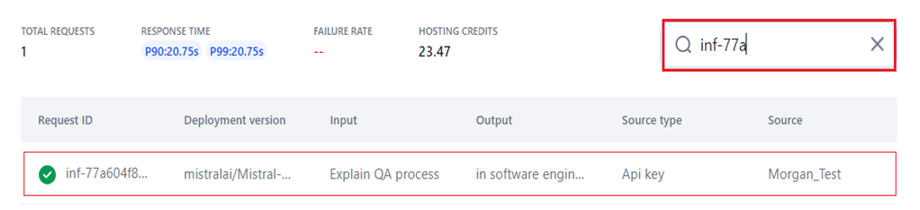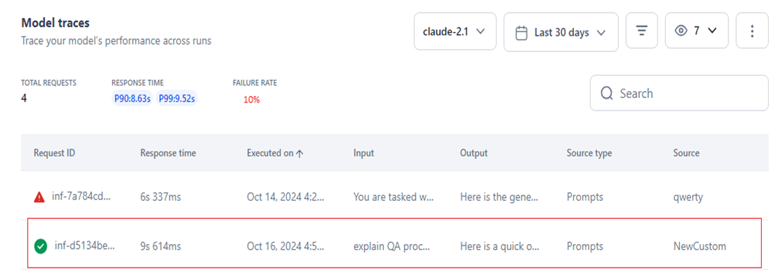 Search: You can locate specific model traces records on the UI by entering the run's Request ID in the Search textbox. The system returns matching results, as shown below.